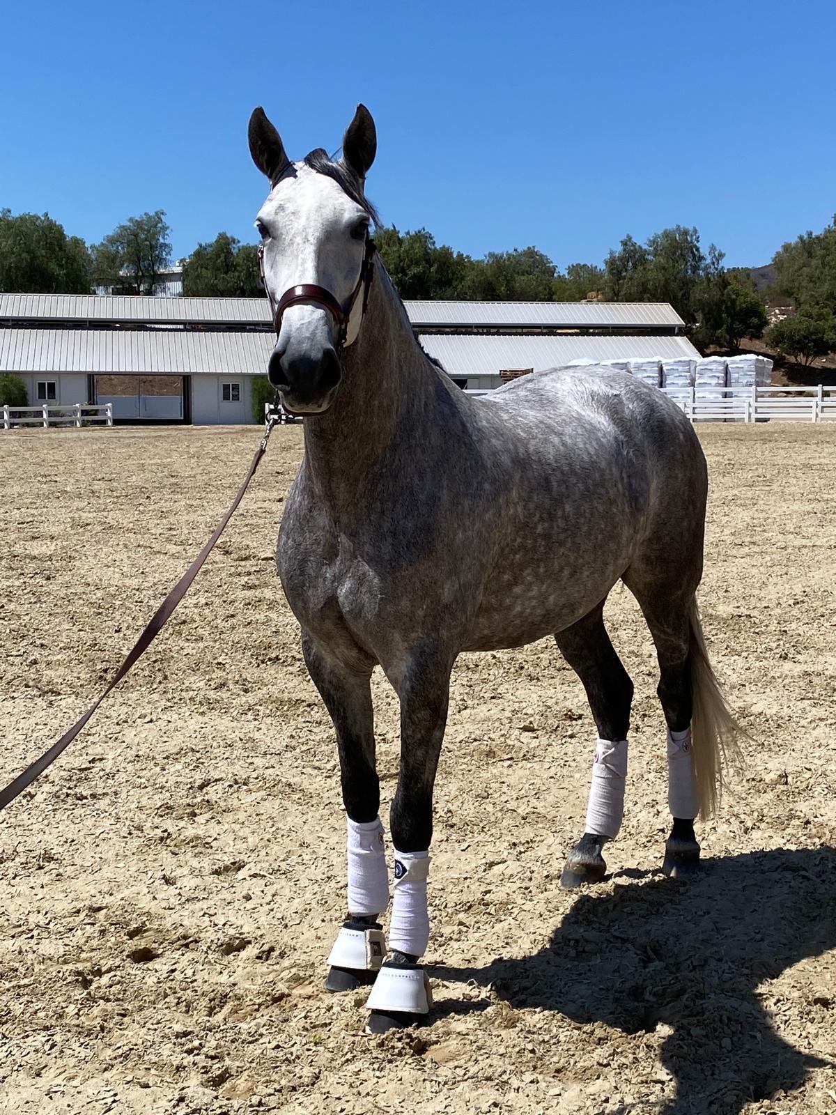 2019, 16 hands, dark grey PRE mare with excellent bloodlines Kabileño VIII - Atlántico PAL with three quality gaits, a super walk, great canter and expressive trot with a nice trot extension. She is very willing, smart, brave, levelheaded and is extremely comfortable to ride with a forward thinking mindset. She is first level schooling second/third level movements and has a good start on a flying change. She is very good on trails, cavalettis, riding in new places and would do well for an amatuer or junior rider in a training program that wants to move up the levels. She is showing good potential to be a FEI horse , is sweet, easy to handle, a barn favorite that’s very personable and connects with her person. Located in Los Angeles area